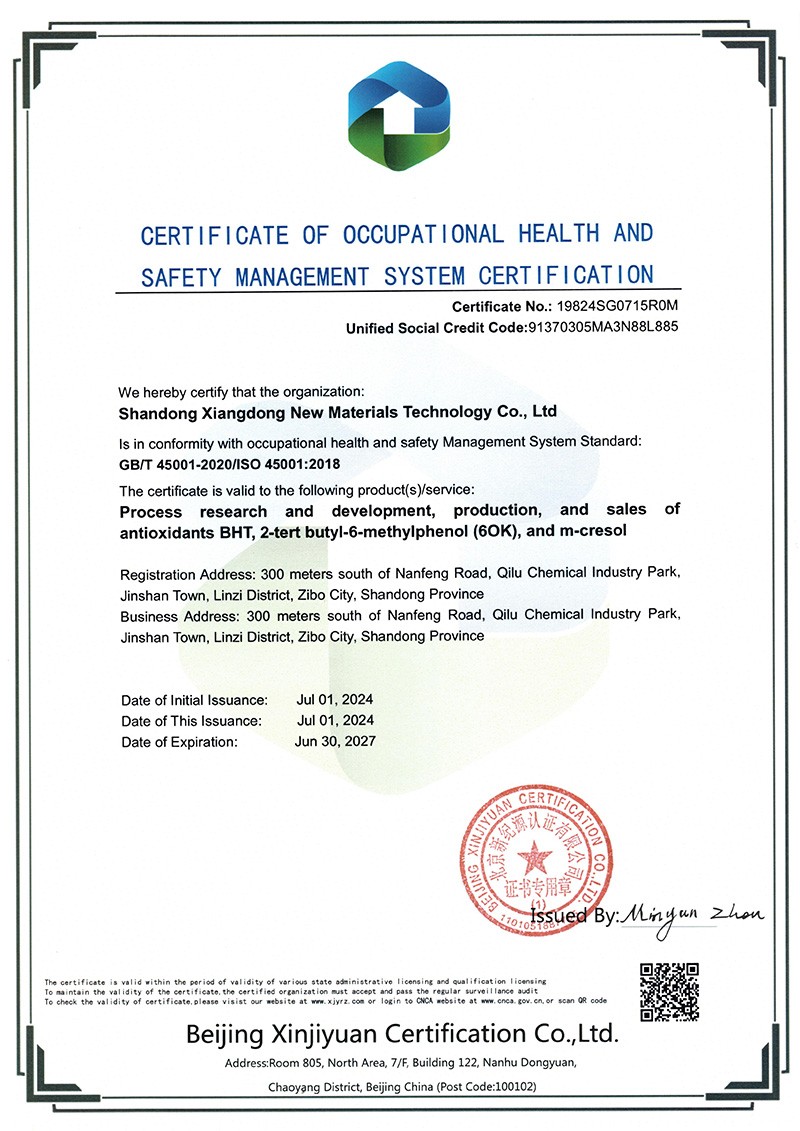 山東祥東新材料科技有限公司1.2萬噸/年6-叔丁基鄰甲(60K)、4-叔丁基鄰甲酚(偏 24 酚)和 4,6-二叔丁基鄰甲酚(偏 246 酚)烷基甲酚項目竣工環(huán)境保護(hù)驗收監(jiān)測報告